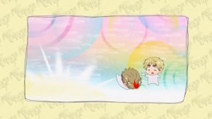 France est en train de lire le journal, surprit de découvrir un article faisant référence à la chute de Russie et aux nombreux os ainsi cassés. En face de lui, on découvre Angleterre en train de broder, il relève soudain la tête et demande à France ce qu’il fait chez lui ! France le rassure : il est juste venu l’embêter.
