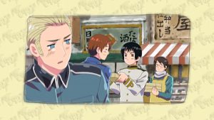 Japon présente à ses amis de l’Axe les bentô que le fils d’un marchand, M. Yoshida, a fait pour eux. Les paniers-repas ont été réalisés en fonction de la culture alimentaire de chacun. Celui de Japon est composé d’une portion de riz agrémenté d’un prune mariné, ce qui lui donne l’apparence du drapeau japonais. Italie est curieux de découvrir le sien : des pâtes, du poulet, des tomates et comme dessert, du zuccotto (Note : zuccotto). Allemagne demande alors le sien et Japon déclare que bien entendu il est un membre important de l’équipe : il a droit à une saucisse sur un petit pic. Allemagne est quelque peu perplexe…