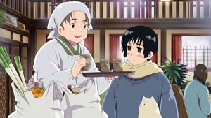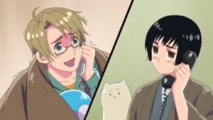 Après le générique, Japon vient d’appeler Amérique pour lui proposer de venir contempler les fleurs de cerisier chez lui. Avant tout, Amérique s’assure qu’il fait bon chez Japon et accepte.