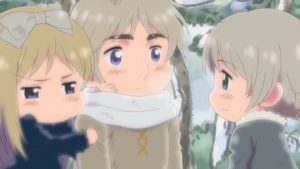 Alors que les trois slaves discutent entre eux (comprendre par là que Biélorussie s’amuse à faire peur à Ukraine qui appelle Russie à l’aide), les trois Baltes les observent à l’angle d’un mur. Lituanie remarque comme Russie est doux lorsqu’il est avec ses sœurs et trouve Biélorussie très jolie. Estonie explique qu’ainsi Russie passe sa frustration sur eux, les Baltes, mais que ça doit être bien d’avoir des frères et sœurs, ce que Lettonie approuve fortement, leur laissant bien entendre qu’il aimerait bien en avoir. Mais Lituanie et Estonie font comme s’ils n’avaient rien entendu.