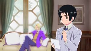 Japon est en pleine réflexion sur l’occidentalisation de son pays. France est ici en visite et Japon pense prendre exemple sur lui pour apprendre sa culture. Il observe du coin de l’œil France étendu nonchalamment sur un canapé.