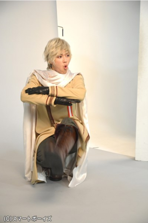 Sa peau blanche est illuminée par la perruque blond platine. Du fait de sa grande taille, Yamaoki-san est habillé d’un long manteau et d’une longue écharpe. …un magnifique Russie qui nous est apparu au studio !
