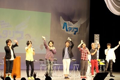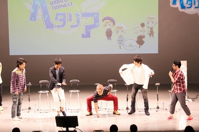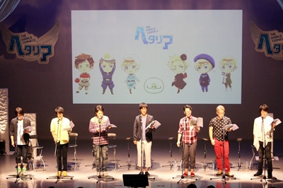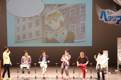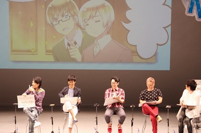 Est venue l’heure de commencer, et après des images de l’opening jamais diffusées de l’anime Hetalia The World Twinkle, les MC du jour Inoue Go, doubleur d’Espagne, et Kôsaka Atsushi, doubleur de Prusse, Estonie et Grèce, sont apparus sur scène ! Les premiers mots ont été ceux de Kôsaka-san, souriant, qui a commenté : « Enfin un event pour les Nordiques ! » D’autre part, Inoue-san a salué le public en blaguant, se demandant bien « pourquoi je suis là alors que je n’ai aucun lien ? *rires* » avec les Nordiques dans la série. Puis, chacun à leur tour, sont entrés en scène Mizushima Takahiro, doubleur de Finlande, qui a salué d’un « moi ! » [NDLT : « salut » en finnois], plein de vie comme les précédents, Sakai Keikô, doubleur de Suède, qui a suivi, Shimozaki Hiroshi, doubleur de Danemark, Iwasaki Masami, doubleur de Norvège, et Asakura Ayumu, doubleur d’Islande. Ils ont salués à la manière de leur personnage, tandis que des illustrations de ces derniers étaient projetées à l’arrière.