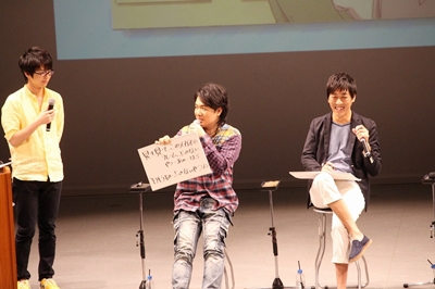 De l’histoire en cours, nous nous sommes dirigés vers la partie « Quiz mimé des Nordiques ». Shimozaki-san devait deviner, et les autres devaient à quatre faire des gestes et lui donner le sujet (en rapport avec l’Europe du Nord). En apprenant qu’avec 8 bonnes réponses sur 10, ils obtiendraient des tickets repas, les cinq doubleurs se sont enflammés. Cependant, la situation était désespérée : Shimozaki-san, stressé par la limite de 30 secondes pour chaque question, est allé jusqu’à 3 questions en ayant enchaîner deux mauvaises réponses.